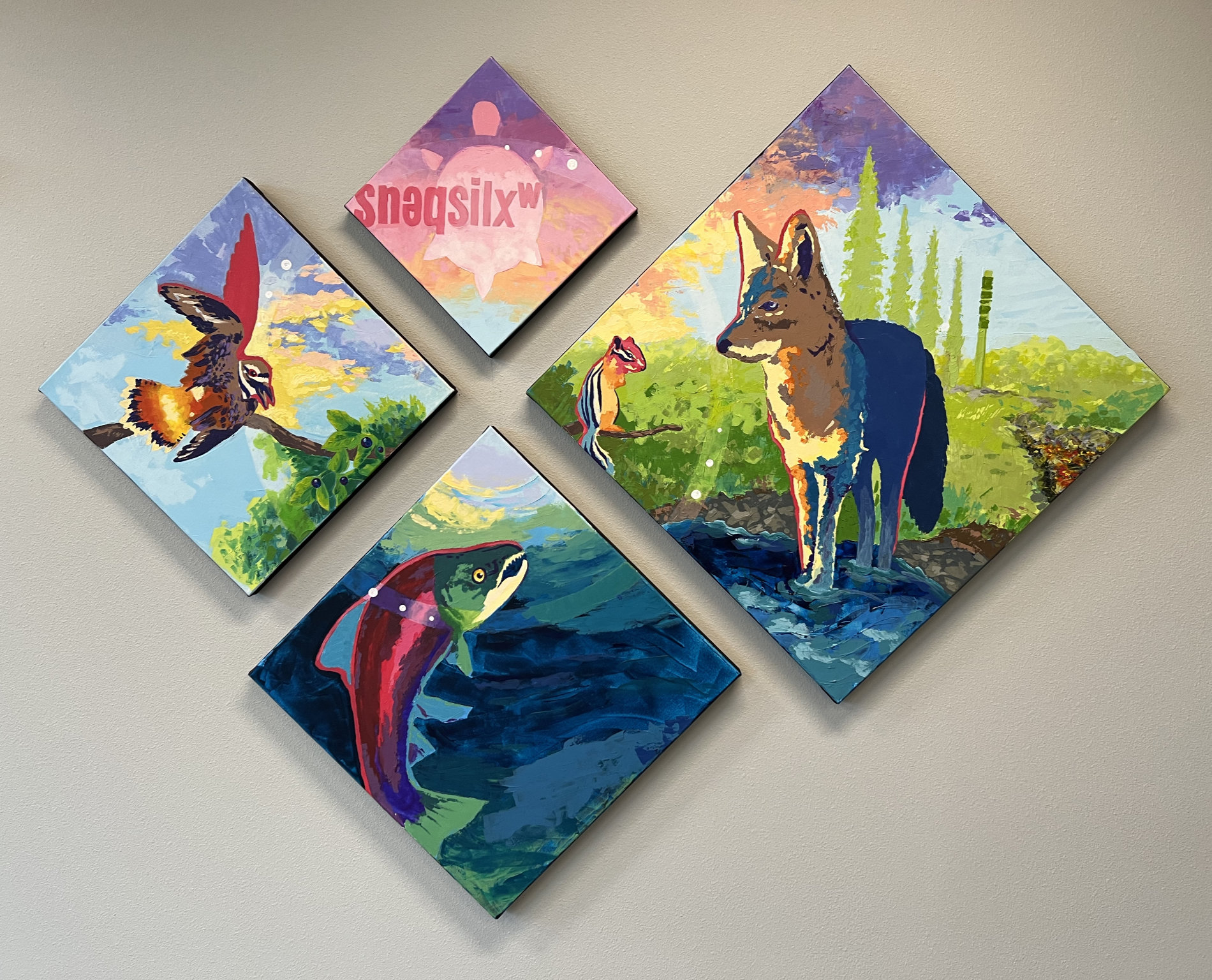 Interior mural at Gonzaga Family Haven. Using a mobile phone, visitors can scan the animals and hear the Salish word for each animal.